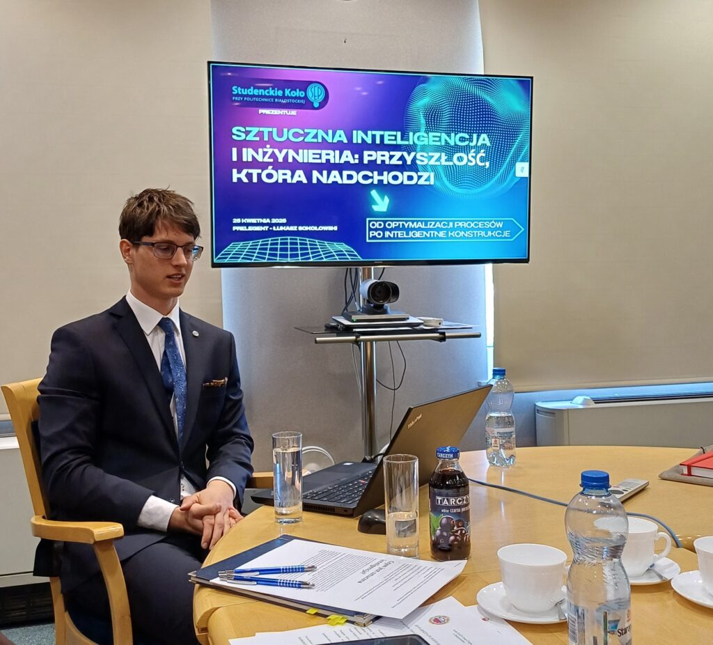 Na spotkaniu przedstawiony został temat sztucznej inteligencji. Prezentację pt. „Sztuczna Inteligencja i Inżynieria: Przyszłość, Która Nadchodzi” w bardzo ciekawy sposób przedstawił Pan Łukasz Sokołowski – Prezes Studenckiego Koła SEP przy Politechnice Białostockiej.
